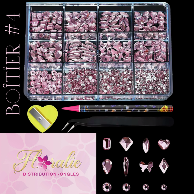 Boîtier complet contenant une variété de bijoux pour ongles en différentes formes et tailles, parfaits pour créer des designs uniques et personnalisés. Chaque compartiment est organisé pour un accès facile et un rangement optimal.