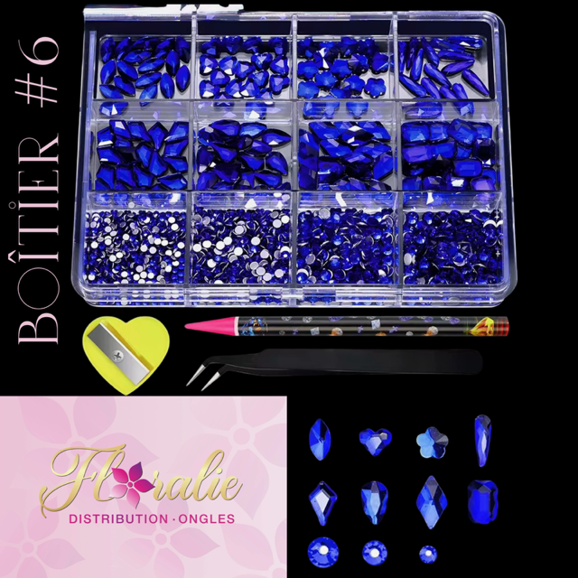 Boîtier complet contenant une variété de bijoux pour ongles en différentes formes et tailles, parfaits pour créer des designs uniques et personnalisés. Chaque compartiment est organisé pour un accès facile et un rangement optimal.