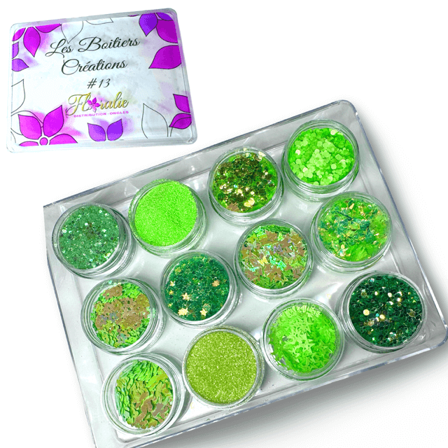 Boitiers créations Floralie Ce boitier contient 12 couleurs de paillettes différentes.