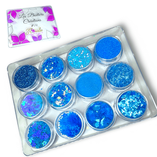 Boitiers créations Floralie Ce boitier contient 12 couleurs de paillettes différentes.